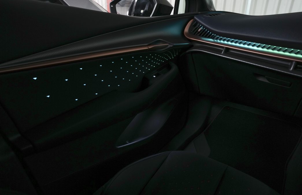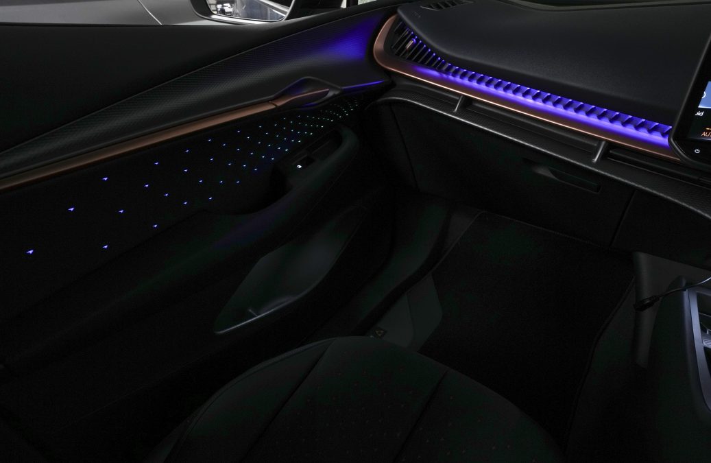 The ambient lighting highlights the car’s modern, sculptural interior design by creating a floating effect around the dashboard and central console, which enhances the vehicle’s futuristic look.
