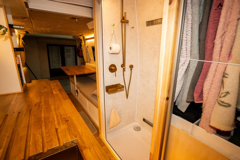 Charlie and Rosie’s van, inspired by their travels in Vietnam and designed with their dog Little Rosie in mind, won the ‘Clever Camper’ category and was shortlisted for the overall prize. Their transformation of a Mercedes-Benz Sprinter included a fully equipped kitchen and a multifunctional wardrobe/shower area.