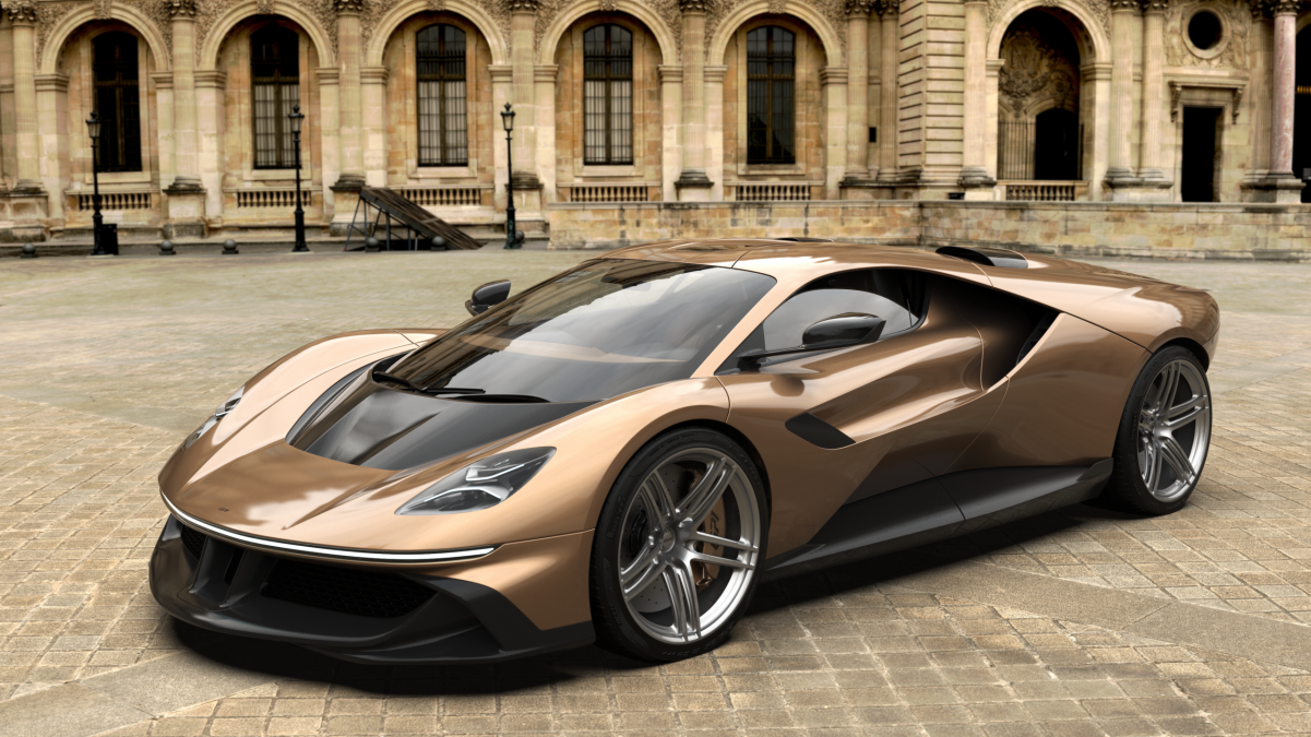 The exterior design, created by Angel Guerra, blends features from the golden age of wedge-shaped cars with modern aesthetics and advanced aerodynamics, including large rear diffusers for enhanced performance.